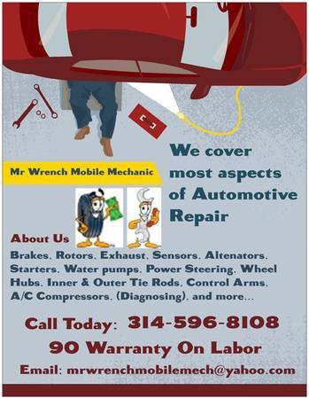 SAVE HUNDREDS HERE!!!! DISCOUNTED MOBILE AUTO REPAIR..... OUR PRICES ARE CHEAP AND WE GIVE A 90 DAY WARRANTY ON ALL LABOR..... #1 CUSTOMER RATINGS IN ST. LOUIS..... COME SEE WHY!!!!! We Offer: OBD2 Diagnostics Readings for Check Engine Light or Any Code. Also:Brakes,Shocks,Struts,A/C,Thermostats,Radiators,Altenators,Power Steering,Starters,Oxygen Sensors,Crank&Cam Sensors, And most other aspects of auto repair that can be done: ON SITE........ 20+Years Exp. We Have #1 Ratings in St.Louis For Service&Customer Satisfaction. Best Part is WE COME TO YOU. Quality Workmanship,Great Prices,Excellent Service. 90 Day Warranty on labor. Mr. Wrench Mobile is KNOWN all over St. Louis Call Us Today.