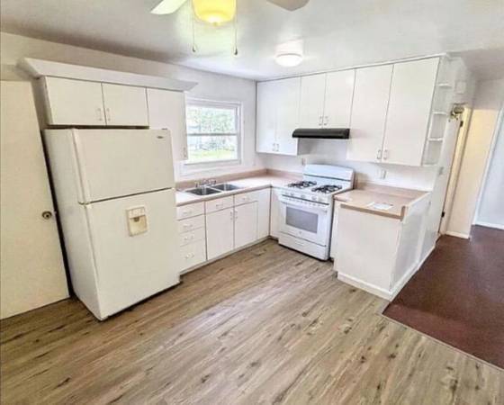 3 Bedroom 1 bath house with detached 2-car garage in Ponderosa Park, Elizabeth. Clean, bright. Newer water heater, kitchen floor and living room windows. New roof and new outside paint. No washer dryer but has hookups. A dog or cat is ok. Has a loafing shed and fully fenced for a horse but the water needs to be carried or brought from the house by a bucket after the first freeze. Pictures provided show house, access to loafing shed in back, and loafing shed.