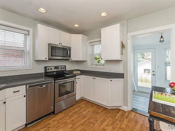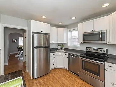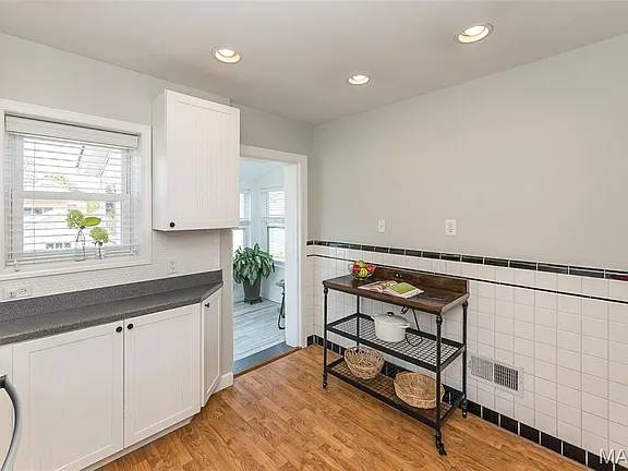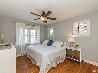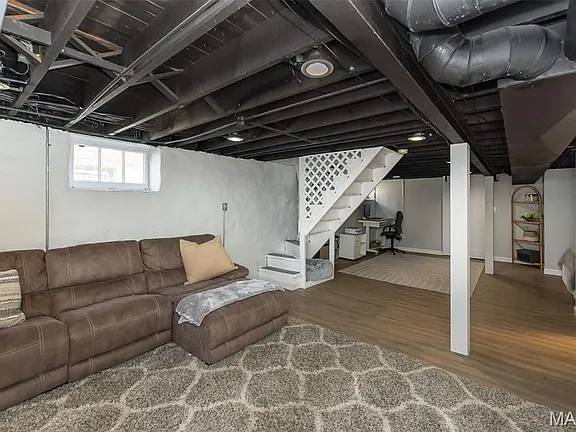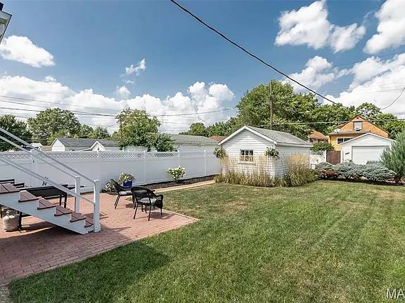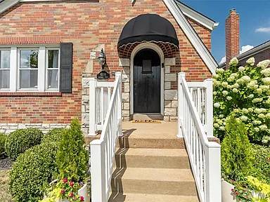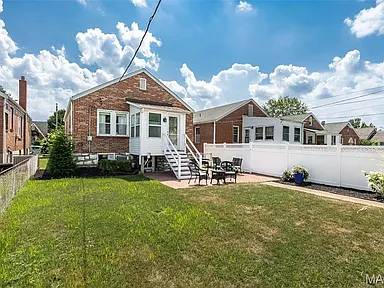 Classic 2-bed, 2-bath brick home in Lindenwood Park with hardwood flooring, decorative fireplace, sunroom, fenced patio yard, stainless kitchen, finished lower level (family + office), laundry room, and attached garage. Roof and water heater recently replaced.