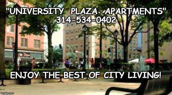 Live in the heart of St. Louis, where you're always less than 15 minutes away from all things that make St. Louis so unique! You've got the Saint Louis Zoo (free admission), The Fabulous Fox Theater (right next door), The Hill, The Botanical Gardens, Forest Park, close to Downtown St. Louis and the list goes on and on! Be ONE with St. Louis while enjoying your stay at University Plaza Apartments.