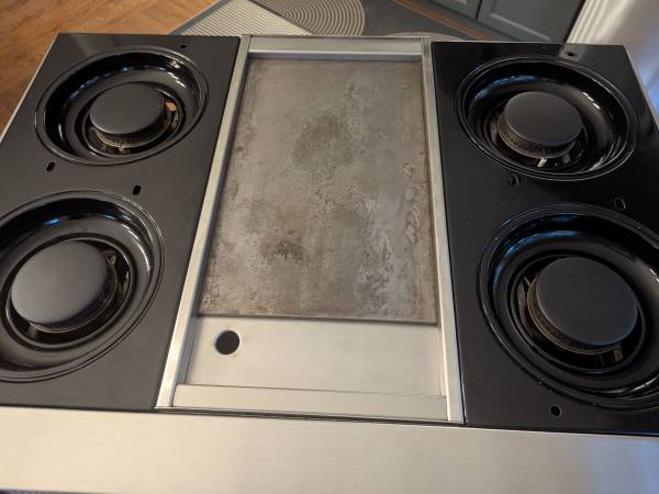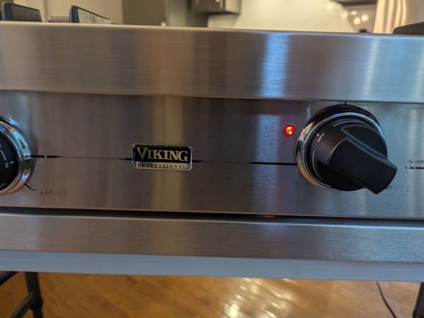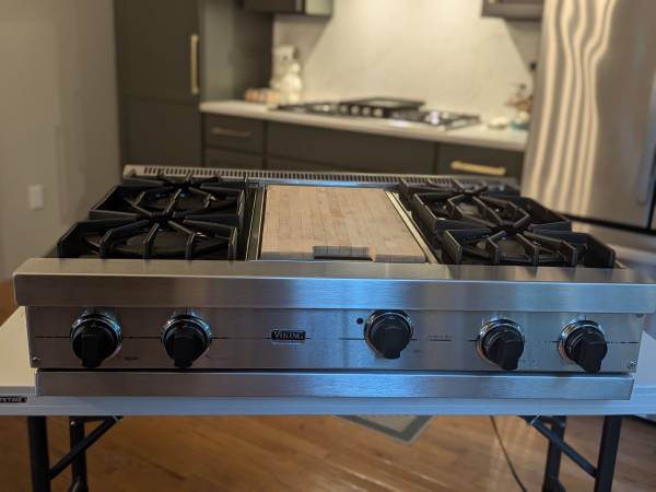 Beautiful viking 36 inch gas cooktop with 4 burners and built in griddle. Comes with custom wooden griddle cover/ cutting board. Heavy duty commercial grade. Comes with gas regulator and stub out.