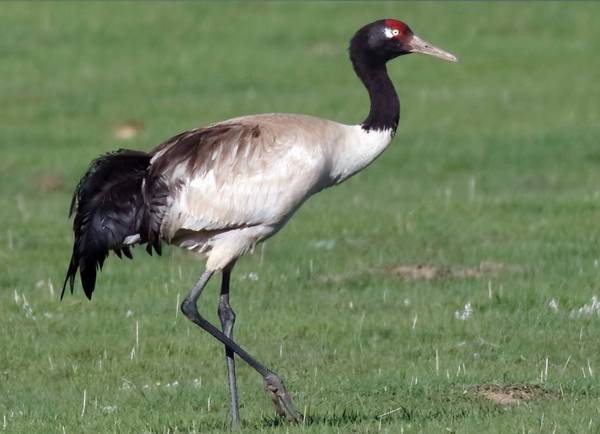 These cranes, whose scientific name is Grus nigricollis, are a vulnerable Red list species whose populations are declining. It is 59” long with a 92” wingspan, and it weighs 5.5 kg. It is whitish-gray, with a black head, red crown patch, black upper neck and legs, and white patch to the rear of the eye.