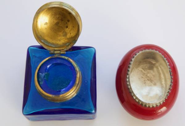 All have secure lids. The blue jar uses a hinge to open, the frosted glass one’s top unscrews, and the cornelian colored one simply lifts up.