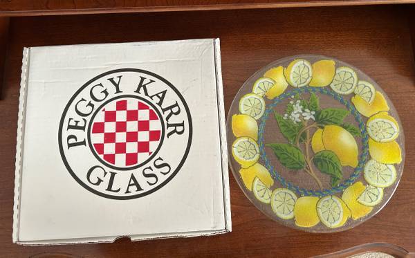 Vintage Peggy Karr Fused Glass Plate w/Box. 11in. Round Plate - Like New. No damage. Box - shows wear. $25 ***Manchester - Hwy 141 and Big Bend Blvd**** Please include your PHONE NUMBER and DAY/TIME...