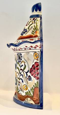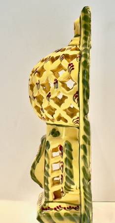 It is also in the ceramic tradition of the Mediterranean world but with its own viewpoint and technique. Similar to the first piece, it can be hung on a wall or set on a flat surface; there is a 'built-in' candle receptacle feature inside the back.