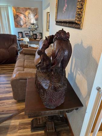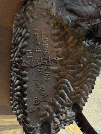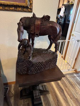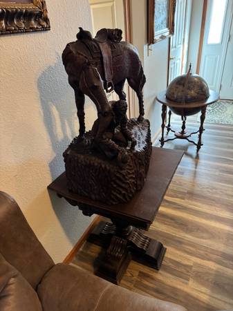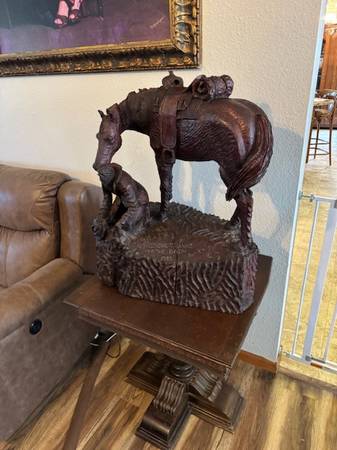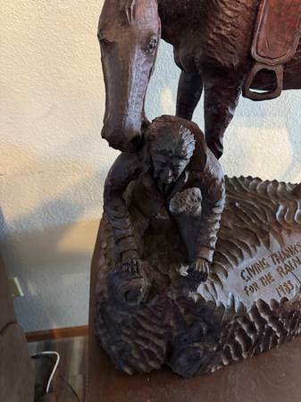 WOOD SCULPTURE 1985 - DON COLP ARTIST - VERY LARGE WITH STAND - 3 FOOT DIA. HORSE WITH RIDER " GIVING THANKS FOR THE RAIN" GREAT CONDITION 3,000.00