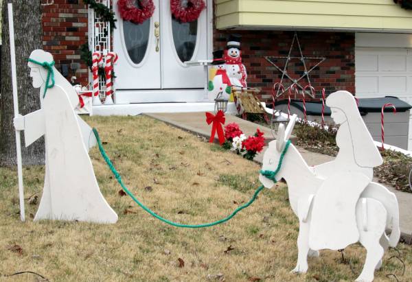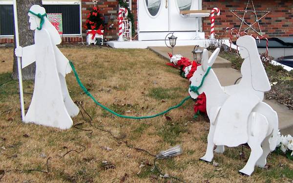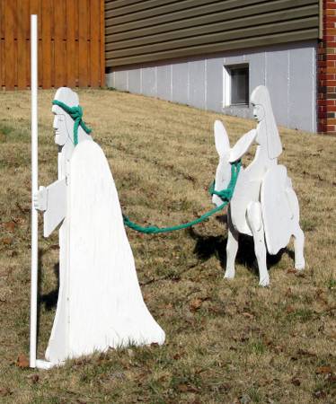 Christmas outdoor display Mary and Joseph Journey to Bethlehem handcrafted from outdoor 3/4 plywood in two sections Joseph walking leading Mary on a donkey. Remove donkey legs and ears to store.