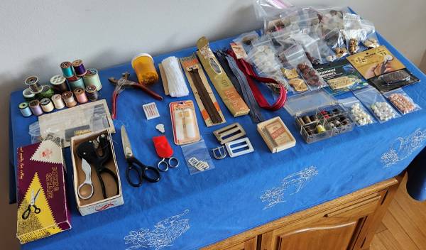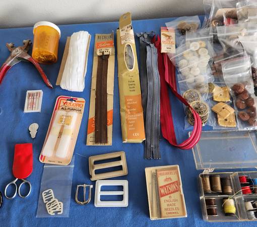 This assortment of sewing items include thread, hundreds of buttons, beads, hooks, eyes, loops, needles, Velcro strips, zippers, buckles, bobbins, scissors, new pinking shears and more.