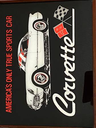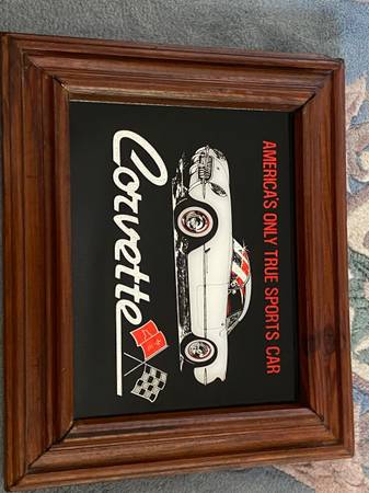 1953 Corvette-Heavy Wood Frame 19" x 16" With Glass. Picture is 13 1/2" x 10 1/2". Silver & Red Foiled so it glitters. Very Nice