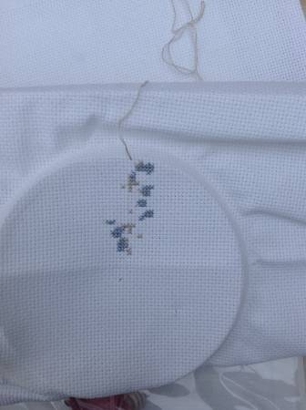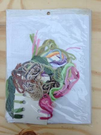 Kit has been opened and started (barely, see pic). All original components are there except for the needle. (Note that the kit does not come with the dowels for hanging and never did)
