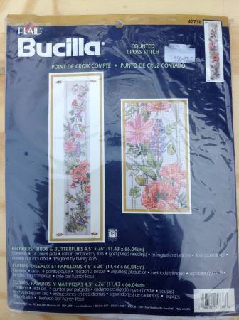 Offered for cash sale is the Bucilla #42738 counted cross stitch kit “Flowers, Birds, & Butterflies” designed by Nancy Rossi. Finished size is 4.5” x 26”