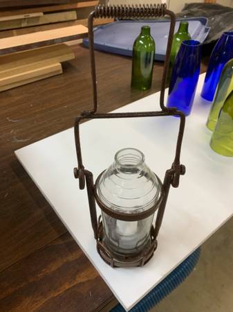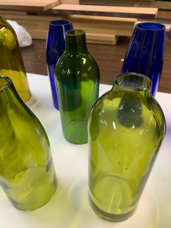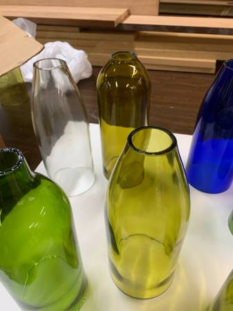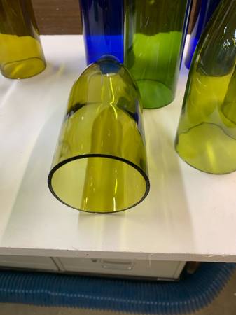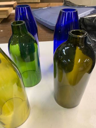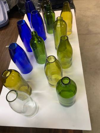 I have 14 wine bottles with the bottoms and the necks removed for crafting , in shades of blue, green , and amber. The last picture is one of several lanterns I made for a wedding years ago.( not included but available separately) Two dollars each selling as a lot of 14 bottles.