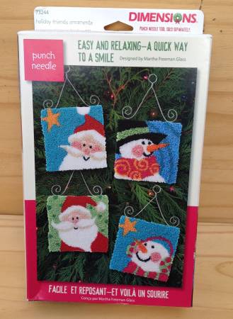 Unused Dimensions Holiday Friends Ornaments (#73244) punch needle kit offered for cash sale. Note that the kit does not, and never did, come with the punch needle tool.