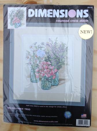 Offered for cash sale Dimensions #35122 “Wildflower Trio” counted cross stitch kit. Finished size is 11” x 12”. Kit is unopened and complete.