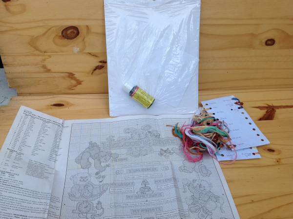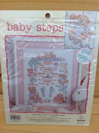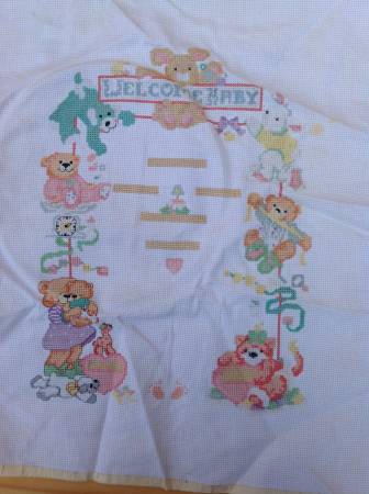 A mostly completed Janlynn “Welcome Baby” #1136-00 cross stitch kit offered for cash sale. You just need to do the backstitching and fill in the baby’s info. The paint for the baby’s footprints is still sealed and liquid. There’s an extra swathe of fabric for the footprints if you don’t want to do them directly on the finished piece (and risk dripping on it). Also included is all the remaining floss, separated and labeled. The finished piece will fit an 11” x 14” opening for framing.