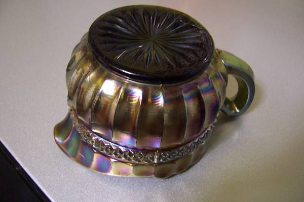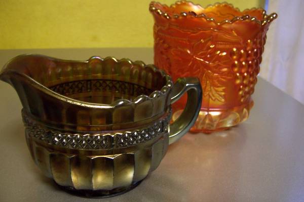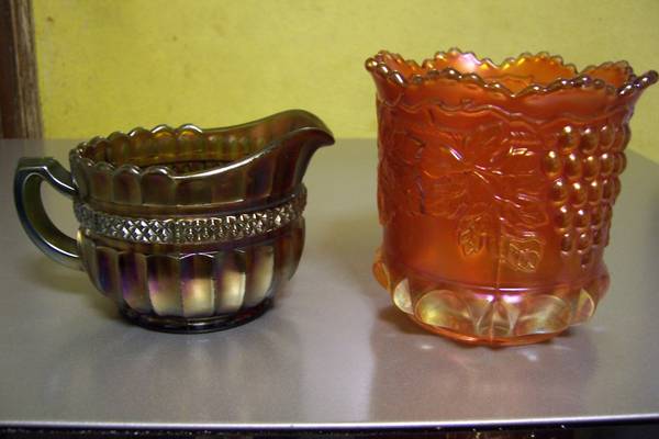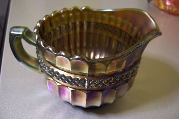 2. Northwood Carnival iridescent green creamer - $20. Measures 5" long to handle by 3 1/2" wide and 3" high.