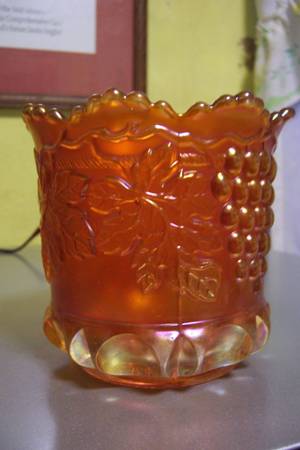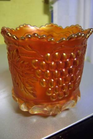 1. Northwood Grape and Cable marigold iridescent spooner - $24. Measures 4 1/2" high with 4" diameter at top.