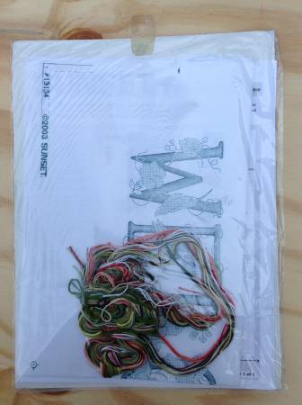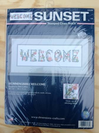 Offered for cash sale SUNSET #13134 “Hummingbird Welcome” by Deb Collins stamped cross stitch kit. Finished size is 18” x 6”. Kit is unopened, but does have a tear in the cellophane wrapper in the back thanks to one of my cats.