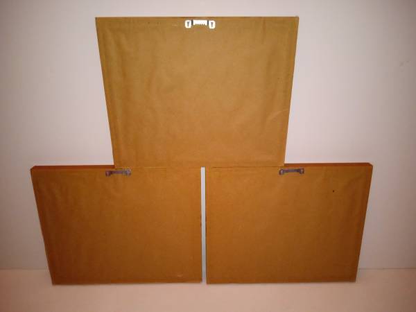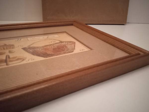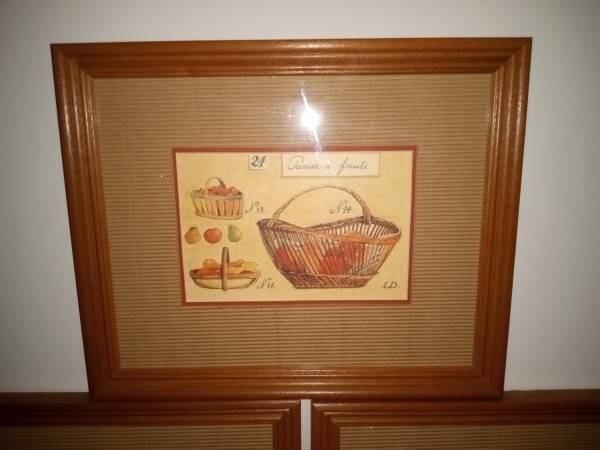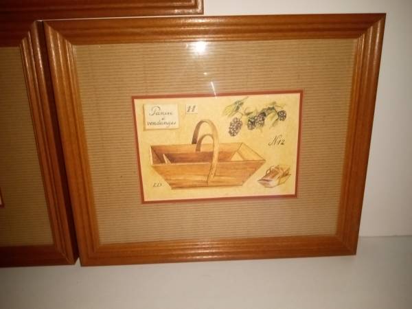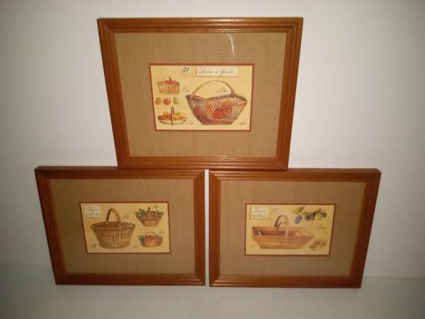 11 1/4" x 9 1/4" Wood frames. Double matted: earthy orange rust ochre mat topped with a natural ribbed mat. Hanging hardware attached. Baskets w/ fruit, produce, & berries. $15 for 3 framed...