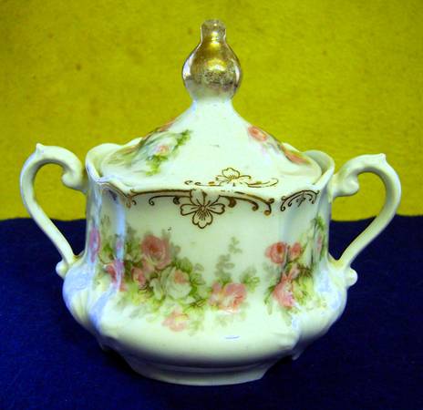This antique hand painted sugar bowl measures 5 3/4" wide handle to handle. Lid diameter is 3 1/4". Meet to exchange. To mail include appropriate postage.