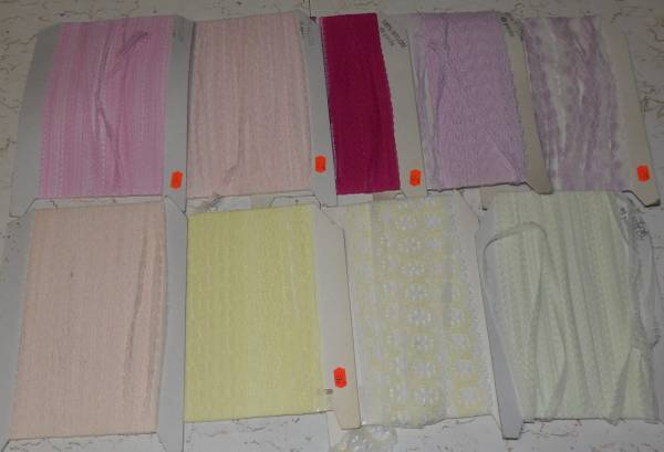 One bag of various colors of narrow lace. There are 18 cards, different designs, shades, and sizes. New lace, never been used. Been stored in a covered tote. Located in Salem, MO.