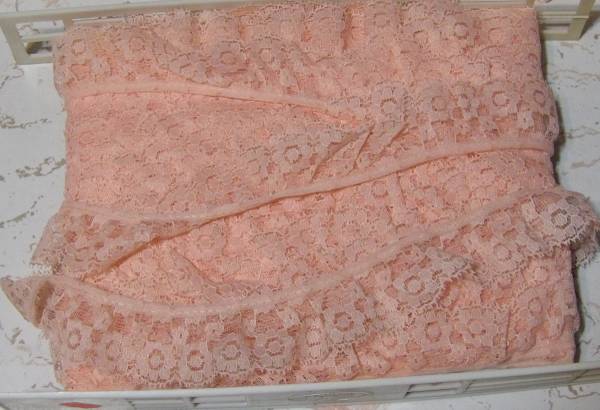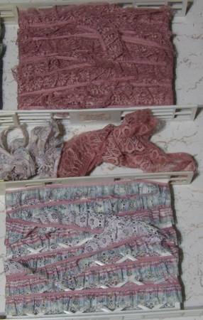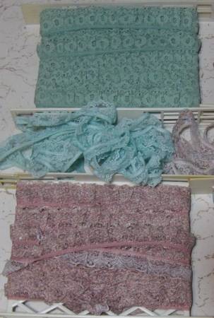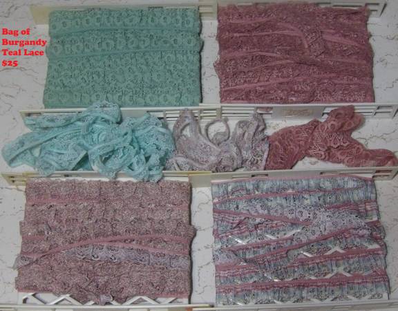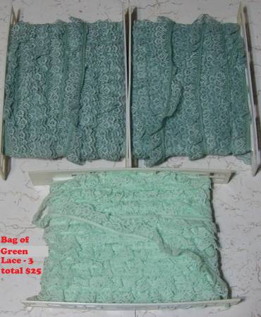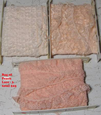 3 bags of new lace - $25 a bag. (Don't know yardage, please don't inquire). This is all new lace-came out of a store sale. It's been kept in storage in a covered plastic container.
