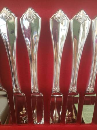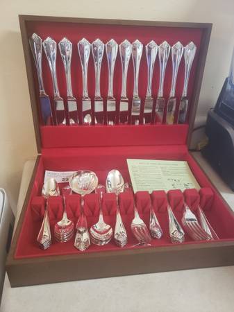 Vtg 1881 Rogers Oneida King James 66pc Silver Plated Flatware Set in Wooden Chest service for 12. In excellent condition. 12 forks 12 salad forks, 12 knives, 12 spoons, 12 teaspoons and 6 serving...