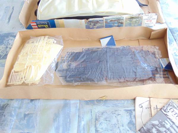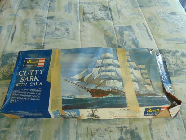 Revell brand Cutty Sark plastic kit from the 70’s. Box is rough, but the kit is complete. The sails have received some damage, but most people build these without the sails so you can see more of the rigging. The sails could also be “weathered” to give the model a more realistic look.
