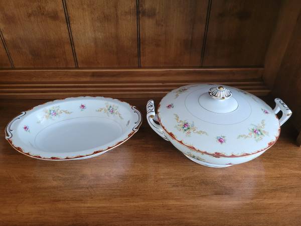2 China serving bowls from 1946 when my parents were married. They are Aladdin fine china in the Wembley pattern and marked Made in Occupied Japan. They are a flower design with gold trim. In excellent condition, but the vegetable dish has some chips on the bottom rim as shown in the pictures. Both dishes for $20. Local pickup and cash only.