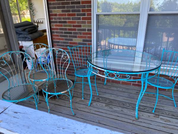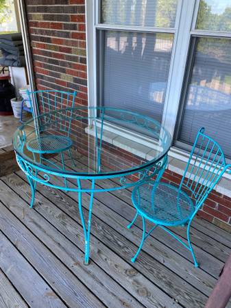 Vintage glass top ornate metal table with ice cream parlor style chairs. There are a total of 5 chairs. There are a set of two that match and the other 3 match. $80.00, call or text three one four 565-3632.