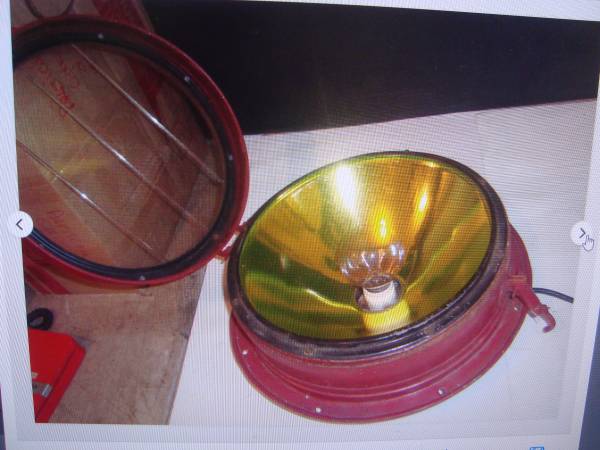 Works great. Has original bulb but any household bulb with work. Nice heavy duty 12' cord with an inline switch. It is 16" wide, 7" front to back. It reads "Crouse-Hinds Co. Incandescent Headlight Type SDF29376". Porch pickup in a nice safe subdivision, just outside of town, right off the interstate. In Illinois but only 15 minutes from the Arch in St. Louis, MO.