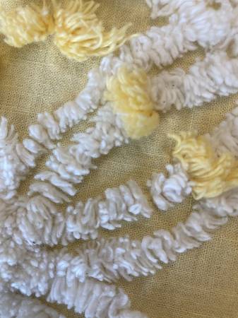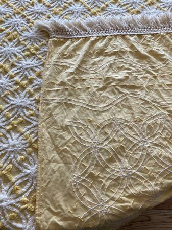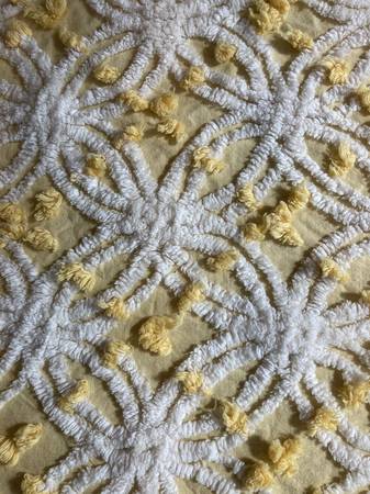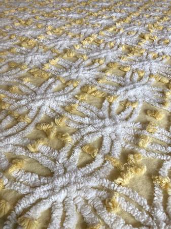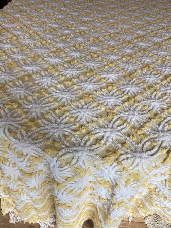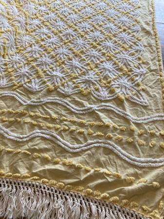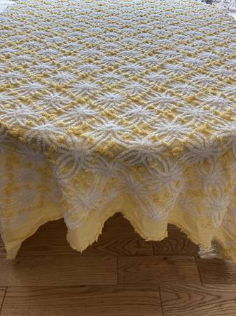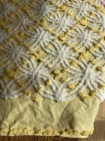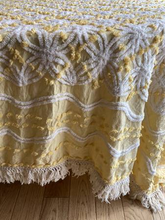#25 Antique Bedspread 99" x 110" King Chenille Yellow and White with Fringe on three sides. One pin hole, hard to find. No stains or rips. I don't think it was ever used. It has small flexs of black (I don't know what it is) I live close to south county mall in Oakville. I prefer text or call please, thanks.