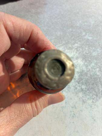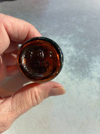 Antique Bottle Small Amber Glass Embossed 25 MILS - 30 - MILS - 707 - 1845? or 1849? Metal lid (center of lid is different material) total 3" Tall. I live close to south county mall in Oakville. I...