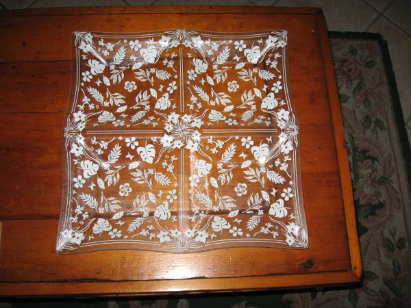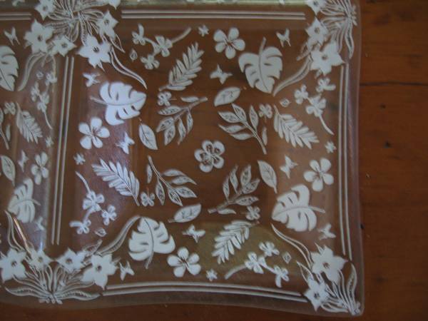 Mid Century Modern MCM large bent glass divided serving tray has white all over floral designs reminiscent of designs by Georges Briard, although this piece is not marked. Use as a cheese and cracker server, sliced fruit, charcuterie board.