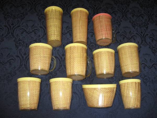 12 pieces of Raffiaware Thermo-temp insulated tumblers to keep your beverage or food cold, mugs, and two bowls, for 8.00.