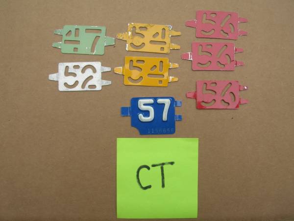 Vintage metal license plate tabs to affix in license plates of the era for year renewal. $10 each or will bundle deal some. Connecticut : 1947, 1952, 1954, 1956, 1957 Nebraska : 1959 New Jersey :...