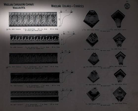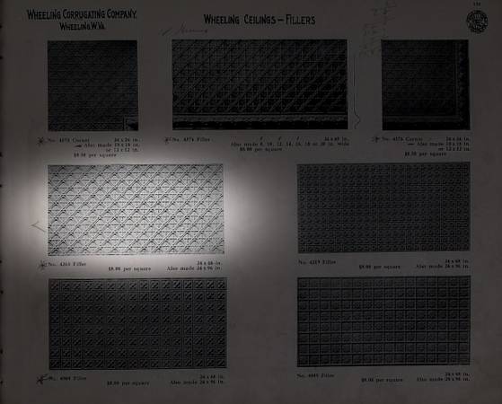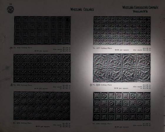 Authentic tin-coated pressed-steel ceiling made by Wheeling Corrugating Company, dating from 1895–1905. Features classic Victorian acanthus, lattice, floral, and palmette patterns—all documented in Wheeling Ceilings No. 310 (1911).