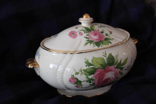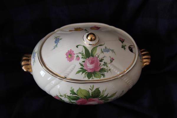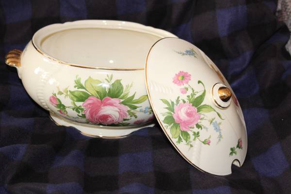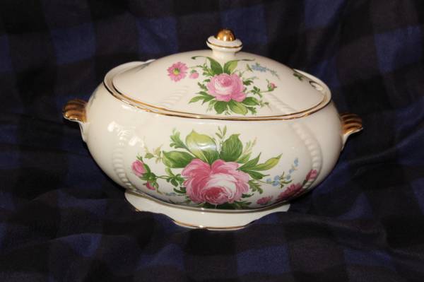 Vintage 1940s Taylor Smith Taylor China Soup Tureen - Floral Rose Design. Beautiful piece. There is a hairline crack on the lid but it does not prevent the tureen from being used. However, tureen is...