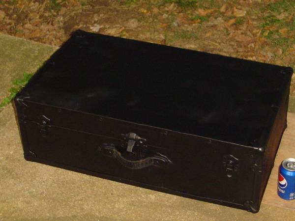 Vintage metal exterior, suitcase style flat-top steamer trunk.
