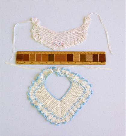 Photos 9 - 11 show the bibs - the first bib has both pink and blue to please everyone. The second bib in the group photo has non-removable blue. The PAIR of bibs is $ 9.