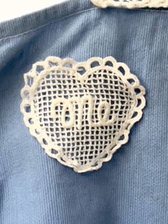 This item is in excellent condition, is clean, no damages, no stains, and would make any little person proud to wear this over a T-shirt type garment, a turtleneck, or some other warmth-retaining comfy top. Based on its age, I’m sure the decorative trim was hand-made and then sewn on.