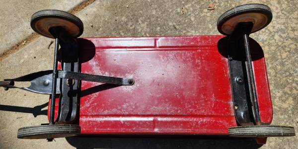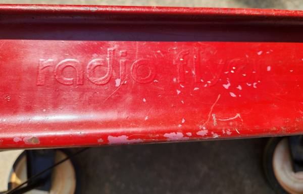 This is a used child’s Radio Flyer 80 metal wagon in good condition. It has a metal flex handle and rubber and plastic wheels. The wagon measures 28 inches in length and 12 inches wide and 9 inches high. It has been repainted but the Radio Flyer logo is still visible.