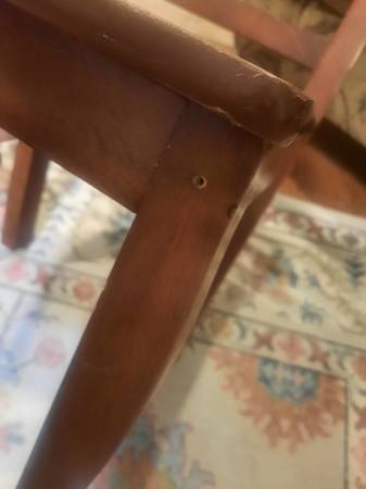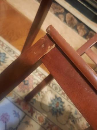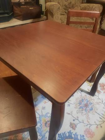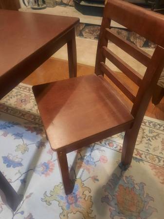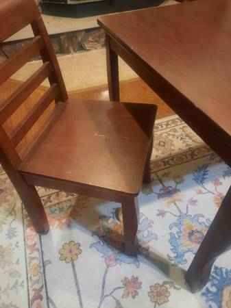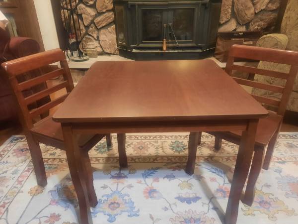 A kids' wood table with 2 chairs. Cherry finish. Purchased at Toys R Us (when that was a thing). It does have scratches as to be expected from a kids' table. Two chair legs were nailed back on. It is still a good, sturdy set in decent shape with more use to be had. Please ask if you want measurements. $25 obo. Located in Festus.