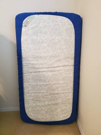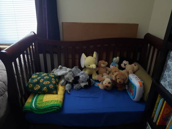 Child of Mine (by Carter’s) Brookline Convertible 4-in-1 crib (Model 15370) that INCLUDES a Mattress, Sheets and Toddler Bed/Daybed Conversion kit. This is a beautiful, very stable sleigh crib that was used only on occasion. Crib is very easy to put together and has sturdy, wide legs. There are 4 mattress height settings. This crib converts to a toddler bed and daybed with a conversion kit which was previously purchased and is included in this set. Additionally, it converts to a full-size bed but the bed rails are not included here.