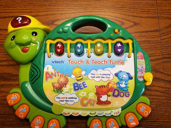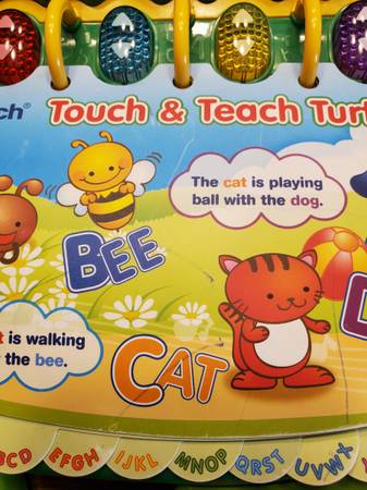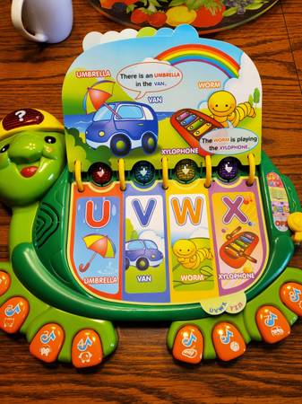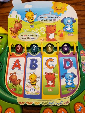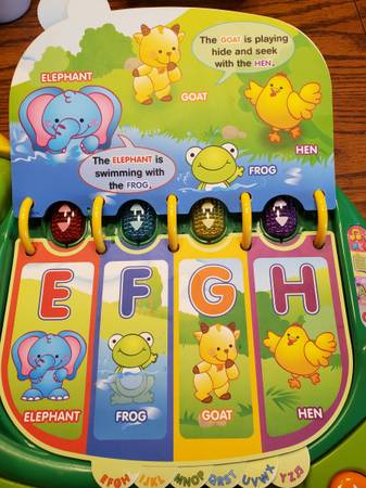 Electronic learning toy features three modes of play for endless fun. In Letter Mode, the light-up color buttons teach letters, shapes, and 30 corresponding objects. Flip the switch for Story Mode, and light-up color buttons tell short stories about the objects while the number buttons play sound effects. One more flip and Music Mode plays sound effects and melodies! With a carry handle for on-the-go learning and over 135 songs, melodies, sounds and phrases, your little one will play and learn for hours! ***Front cover has a few marker swipes.