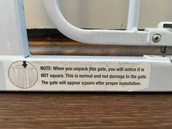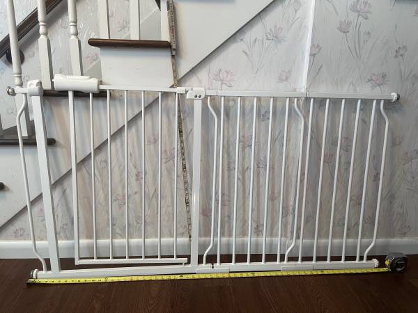 $20 30" tall baby gate. Width varies from 29"-59". Single extension included, as shown in picture. One piece of 1 of the plastic screw covers is damaged, but the bolt/structure is 100% functional.