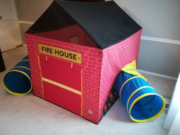 Pacific Play Tent Firehouse House Tent with two tunnels includes 2 storage bags and instructions approx. 58"L x 50"W x 53"H