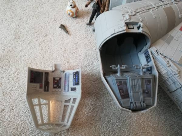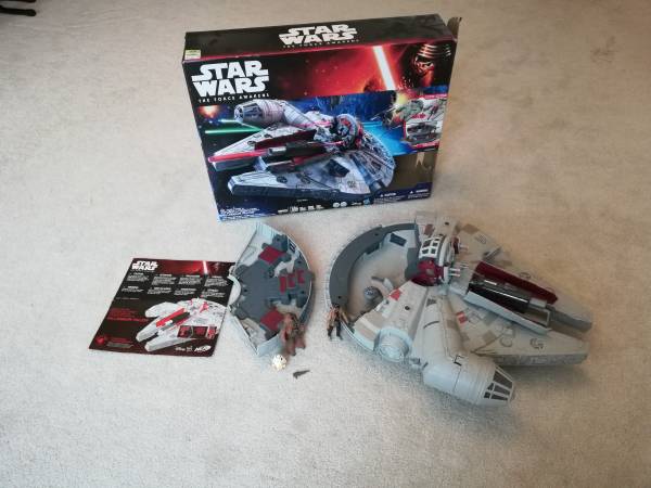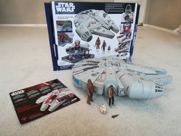 Star Wars Millennium Falcon Original box and instructions Sounds, lights, shoots nerf darts Includes Chewbacca, Finn, BB-8 one side of opening door broken, but still closes and functional