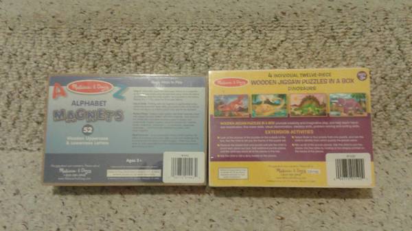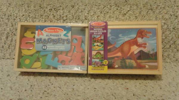New in box, unopened Alphabet Magnets - 52 piece Dinosaurs Wooden Jigsaw Puzzles in a box - 4 puzzles