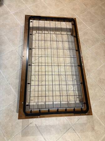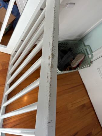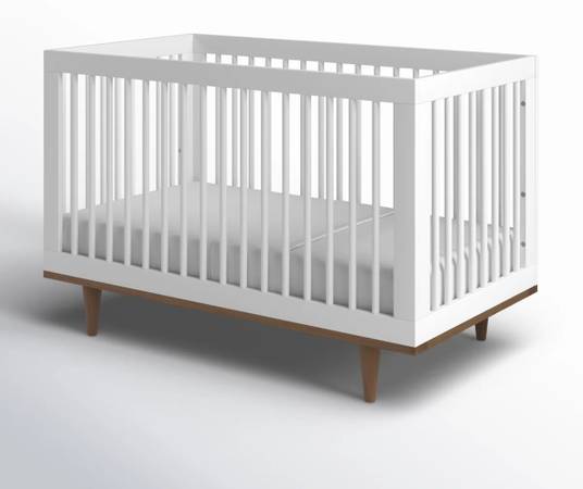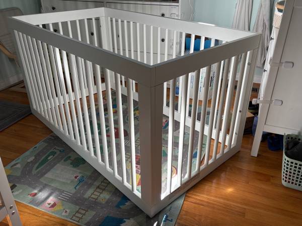 2nd (or 3rd) round hand-me-down crib free to pick-up. Mid-Century design white wood crib with round bars and a stained wood base. 3 heights for mattress (not included.) The paint is showing some wear. Some of the screws got misplaced (i.e. hidden by little hands) during disassembly, but they are a standard size and easy to replace. Assembled pick is from the web, actual crib is pictured in disassembled pics.